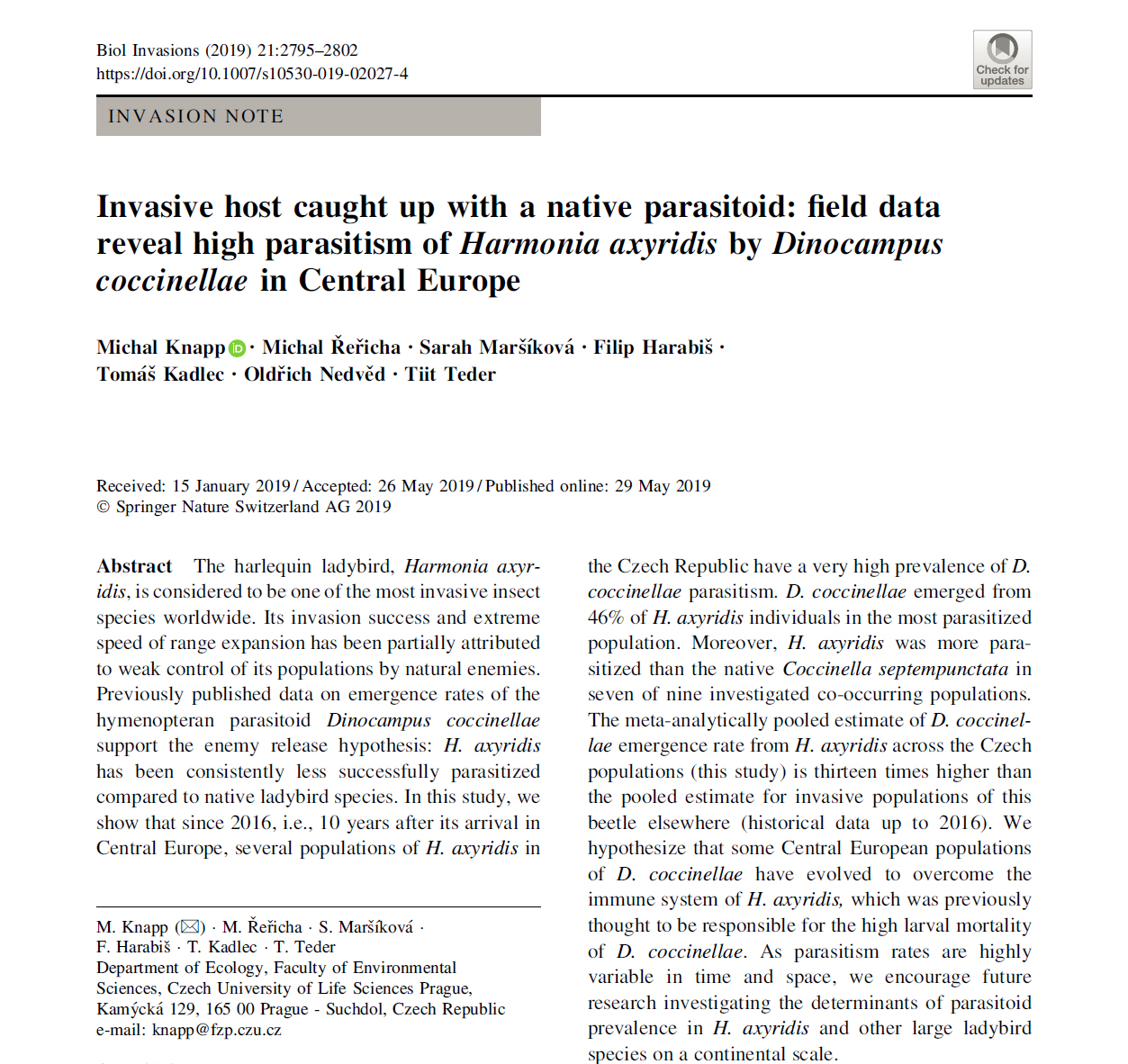 Naše studie s názvem „Invasive host caught up with a native parasitoid: field data reveal high parasitism of Harmonia axyridis by Dinocampus coccinellae in Central Europe“ publikovaná v časopise Biological Invasions ukazuje, že v Čechách se stalo něco zajímavého. Místní populace slunéčka východního jsou neobvykle často vysoce parazitovány lumčíkem Dinocampus coccinellae, o kterém se doposud tvrdilo, že slunéčko východní je pro něj spíše nevhodný hostitel. Předpokládaným vysvětlením je adaptace lumčíka na tohoto v ČR velmi běžného hostitele. Přímí důkaz však bude potřeba získat za pomoci laboratorních experimentů.