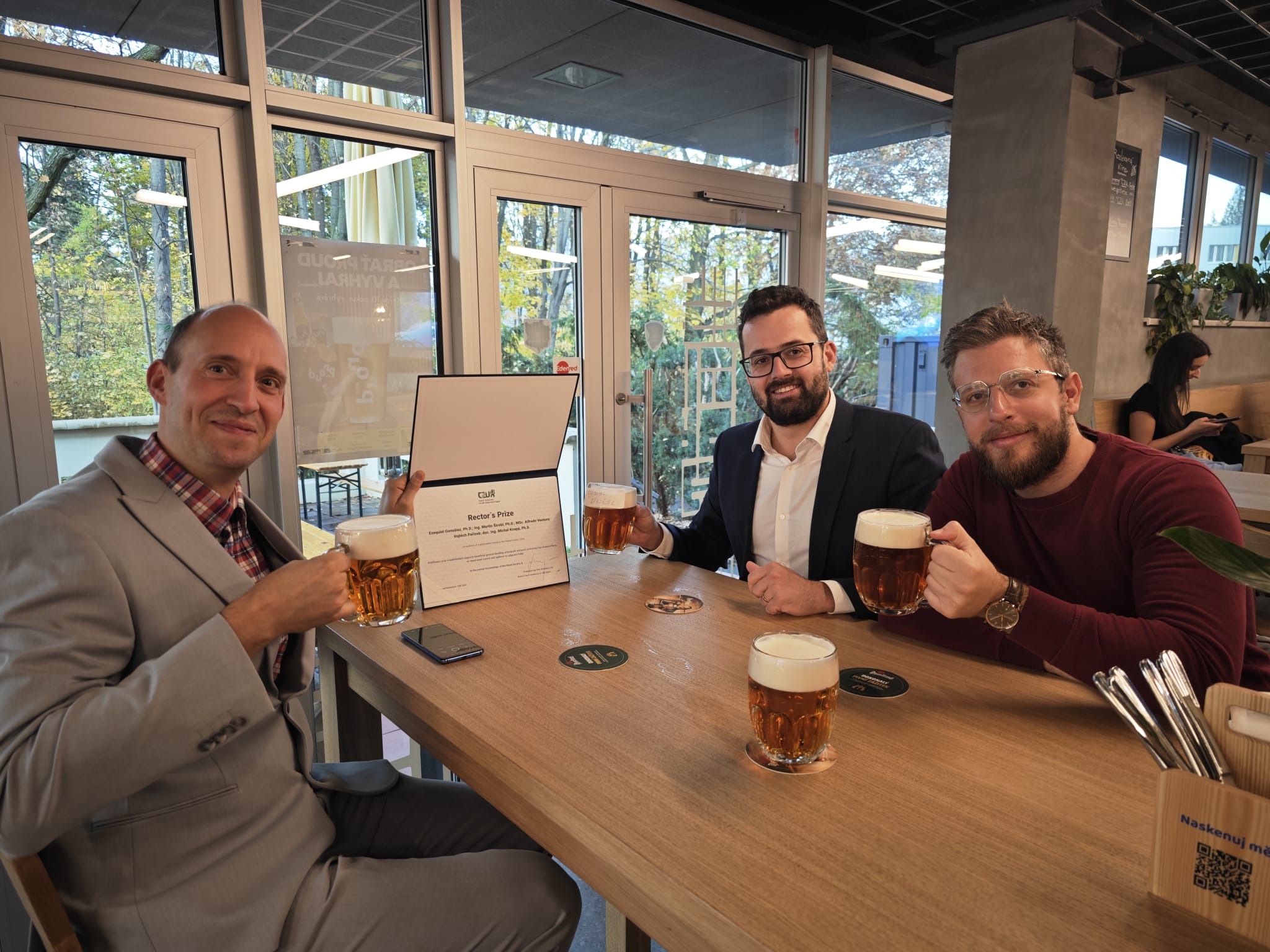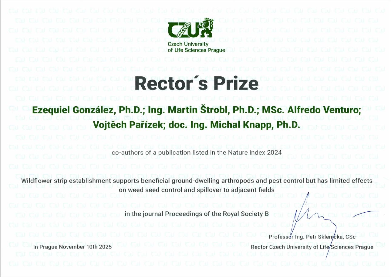V aule ČZU proběhlo slavnostní předávání cen rektora, při němž byli oceněni i členové našeho týmu: Ezequiel González, Martin Štrobl, Alfredo Venturo, Vojtěch Pařízek a Michal Knapp. Vojtěch se stal pravděpodobně jedním z nejmladších držitelů tohoto ocenění v historii univerzity. Ještě jednou srdečně gratulujeme všem oceněným a zejména Ezequielu Gonzálezovi za jeho přínos k výzkumu. Zároveň bychom rádi poděkovali kolegům z VIN AGRO s.r.o. za dlouhodobou spolupráci.