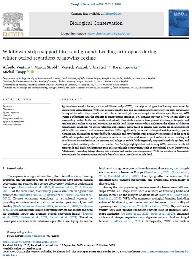 Naše nejnovější studie ukazuje, že biopásy představují důležitý prvek zemědělské krajiny nejen v létě, ale také v zimě, kdy poskytují vhodný biotop pro pavouky, střevlíky, drabčíky a zároveň přispívají ke zvýšení početnosti ptáků. Atraktivita orné půdy pro pavouky, střevlíky, stonožky a mnohonožky v zimě výrazně klesá, pokud je po podzimní orbě ponechána bez jakékoli vegetace, zatímco u drabčíků je situace opačná. To, zda byl biopás před zimou posekán či nikoli, mělo v našich výsledcích překvapivě jen malý vliv na společenstva členovců běhajících po povrchu půdy. Celé znění studie publikované v časopise Biological Conservation si můžete přečíst zde.