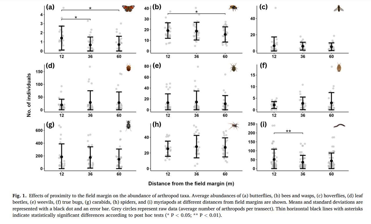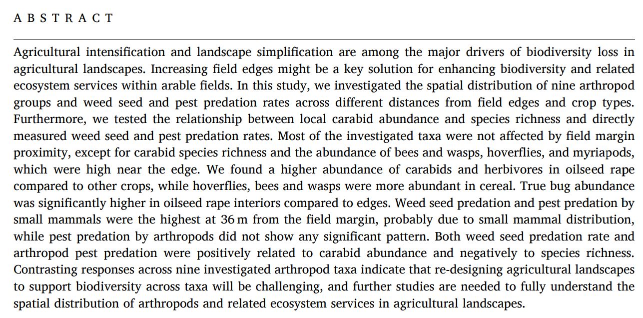 Posíláme velkou gratulaci Alfredovi k jeho prvnímu prvoautorskému článku. Ve studii publikované v časopise Agriculture, Ecosystems and Environment ukazujeme, že různé skupiny členovců reagují na vzdálenost od okraji pole různě, a tak nebude snadné vyladit velikosti a tvary polí tak, aby to svědčilo všem skupinám. Současně vliv pěstované plodiny se liší mezi skupinami členovců, takže diverzita plodin bude jeden z klíčů k diverzitě členovců. A nakonec jsme testovali vztah mezi společenstvy střevlíků a ekosystémovými službami, které poskytují. Kupodivu vysoká druhová diverzita střevlíků nevedla k vyšší míře predace škůdců a semen plevelů (spíše naopak). Klíčová byla spíše početnost (klidně běžných druhů střevlíků) - prostě více je více.