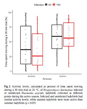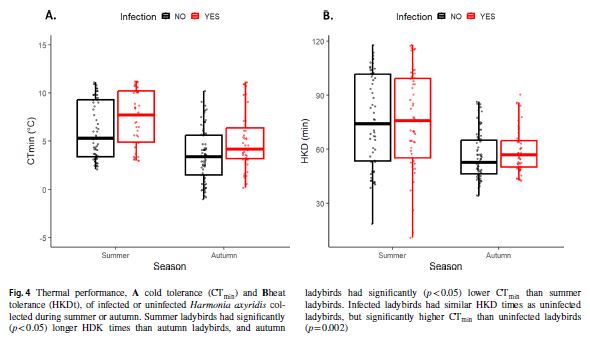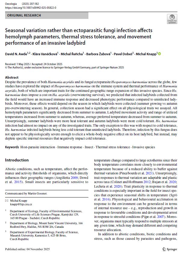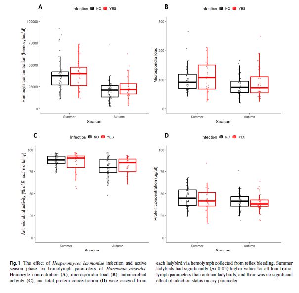 Naše nejnovější ekofyziologická studie ukazuje, že parametry hemolymfy slunéček, částečně odrážející stav jejich imunitního systému, výrazně klesají od léta do podzimu, ale překvapivě nejsou vůbec ovlivněny infekcí parazitické houby Hesperomyces harmoniae. To odolnost vůči teplotním extrémům je ovlivněna nejen sezónou (a tedy aklimatizací), ale infikovaná slunéčka mají nižší odolnost vůči nízkým teplotám, což může částečně vysvětlit jejich nižší přežívání během zimy pozorované v jedné z našich předchozích studií. Parazitická houba přitom neovlivnila pohybovou aktivitu slunéček ani jejich preferovanou teplotu, a nepodařilo se tak potvrdit očekávaný fenomén tzv. „behaviorální horečky“, tedy schopnosti hmyzu léčit se z infekcí pobytem ve vyšších (či nižších) teplotách, než preferují zdraví jedinci. Další detaily studie publikované v časopise Oecologia si můžete přečíst zde.