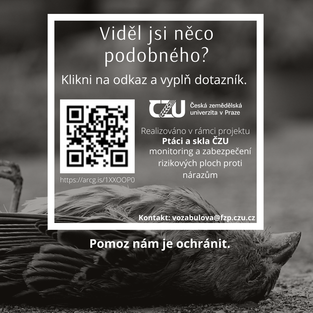 Nález mrtvého ptáka lze nahlásit prostřednictvím emailu vozabulova@fzp.czu.cz s připojenou fotografií, nebo lépe prostřednictvím krátkého online formuláře, který vašim chytrým telefonem načtete přes QR kód na letácích v areálu ČZU nebo vyplníte zde: https://arcg.is/1XXOOP0.