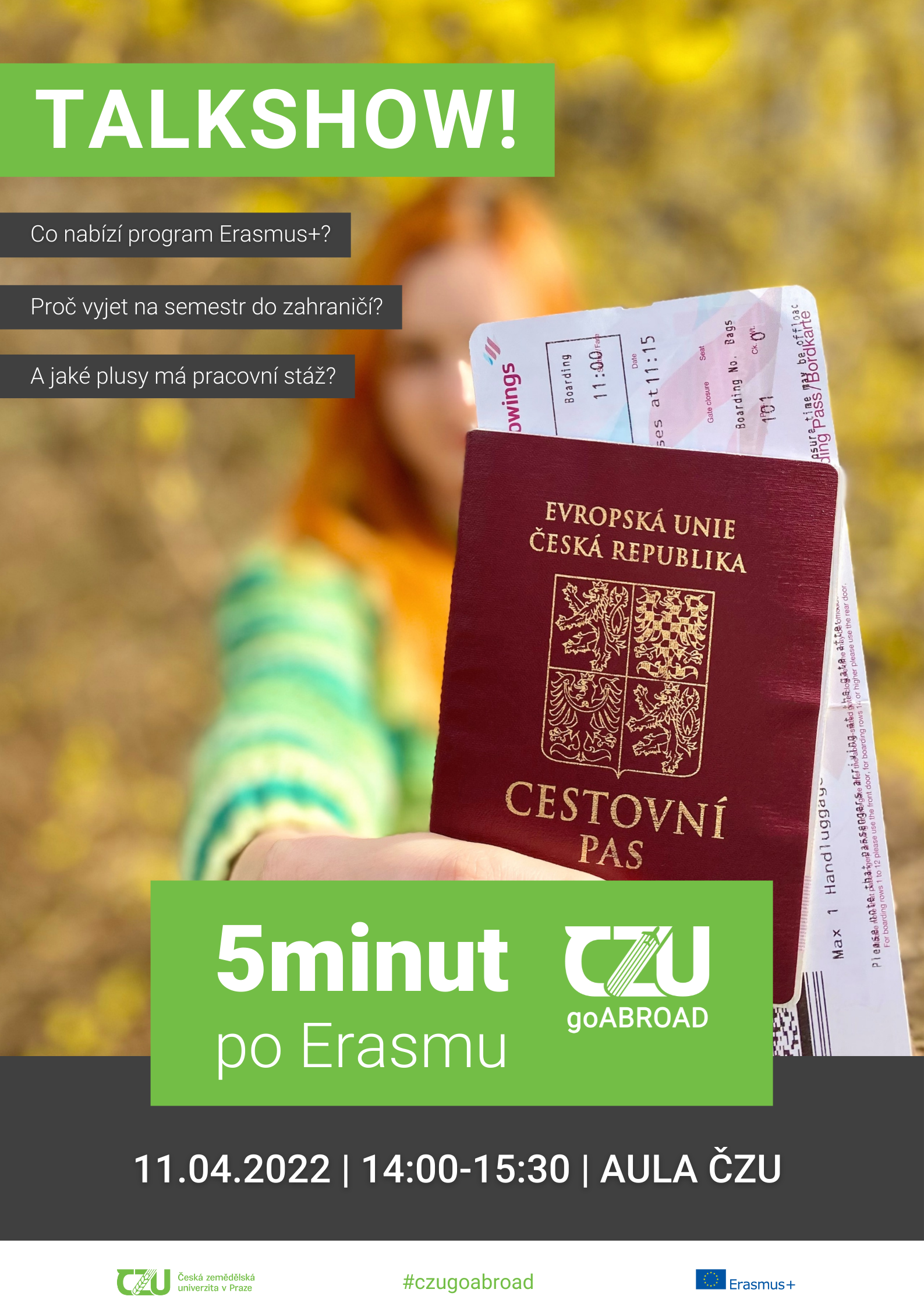 Tak přijďte v pondělí 11. dubna od 14:00 do Auly ČZU na TALKSHOW! 5minut po Erasmu!