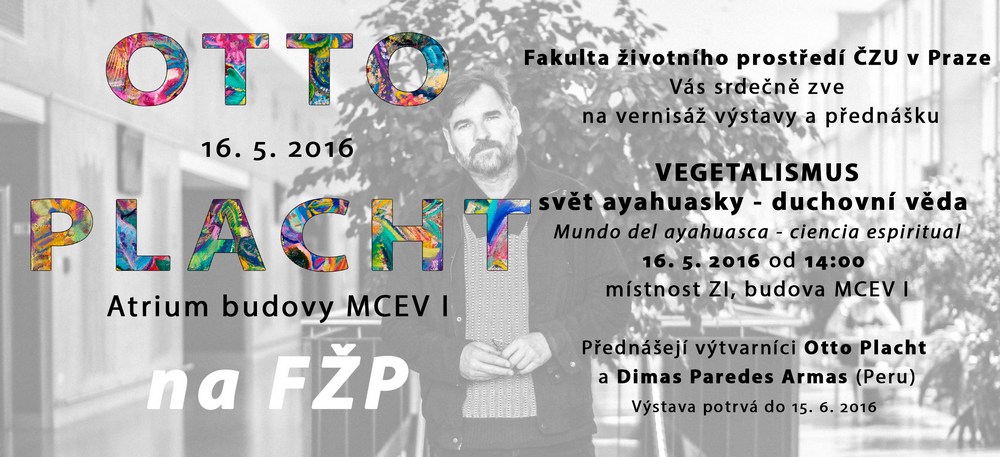 Fakulta životního prostředí ČZU v Praze Vás srdečně zve na vernisáž výstavy malíře Otto Plachta působícího v tropech Jižní Ameriky. Vernisáž se uskuteční cca v 15:00 v atriu budovy MCEV I ihned po skončení přednášky VEGETALISMUS (svět ayahuasky - duchovní věda), která začíná ve 14:00 v místnosti ZI. Přednášejí výtvarníci Otto Placht a Dimas Paredes Armas (Peru). Výstava potrvá do 15. června 2016.