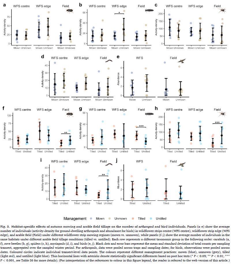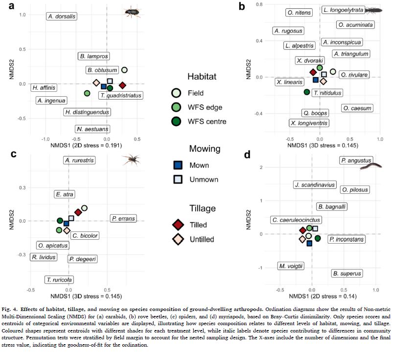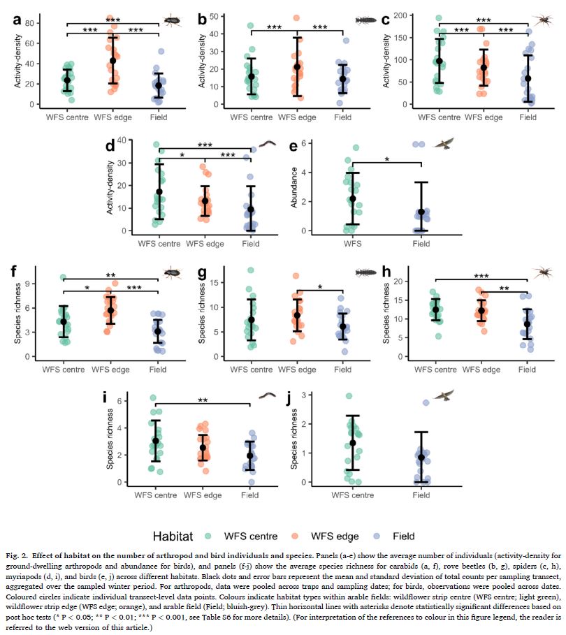 Our latest study demonstrates that wildflower strips represent a key element of agricultural landscapes not only in summer, but also in winter, when they provide suitable habitat for spiders, carabid beetles and rove beetles, while simultaneously increasing bird abundance. In winter, the attractiveness of arable fields decreases markedly for spiders, carabids, centipedes and millipedes if the fields are left without any vegetation after autumn ploughing, whereas the response of rove beetles is the opposite. Whether a wildflower strip was mown before winter or not had surprisingly little effect on assemblages of arthropods active on the soil surface. The full text of the study published in Biological Conservation is available here.
