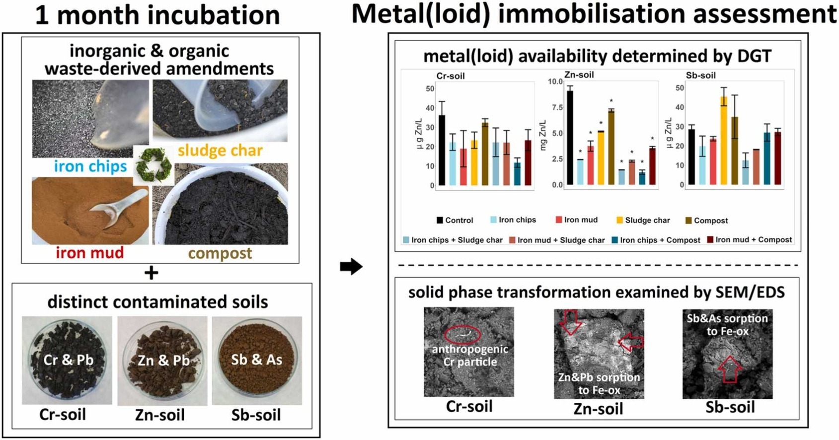 Our recent study in the Journal of Environmental Chemical Engineering (IF = 7.2) evaluated the environmental applicability of several waste-derived amendments for immobilising metal(loid)s in contaminated soils, supporting circular and sustainable economy principles. Four materials – iron chips, iron mud, sludge char, and compost – were tested in contrasting soils to assess changes in contaminant mobility. Results showed that organic amendments generally increased metal(loid) availability, while iron-based amendments achieved up to 99 % immobilisation. Combined treatments also proved efficient in reducing metal(loid) mobility. These findings provide valuable guidance for selecting suitable waste-derived materials for sustainable soil remediation.
